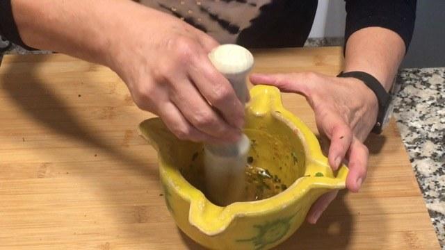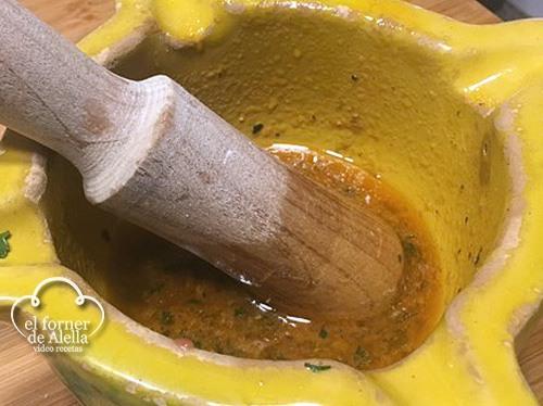 Removemos bien con el palo del mortero hasta que nos quede una salsa bien emulsionada. Tiene que quedar todo muy mezclado.