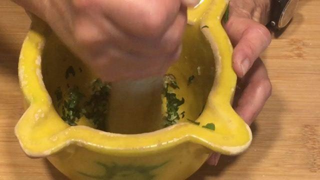 Cortamos las hojas de perejil en trocitos pequeños y machacamos también. Tiene que quedar muy picado.