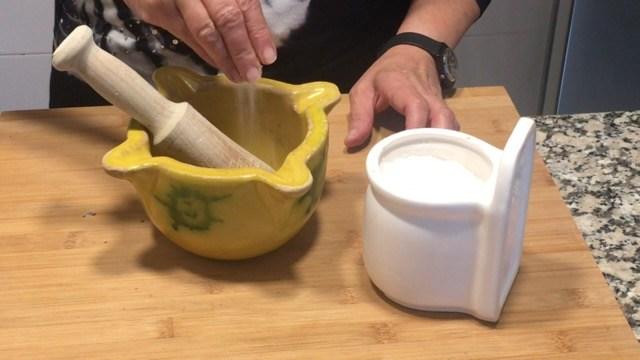 En un mortero ponemos los ajos cortados a trocitos y un poco de sal. Machacamos hasta que quede una pasta.