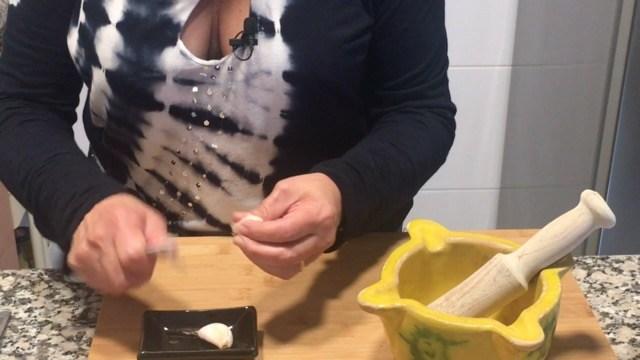 Pelamos y abrimos los ajos por la mitad para poder quitar el germen que está en el centro del ajo.