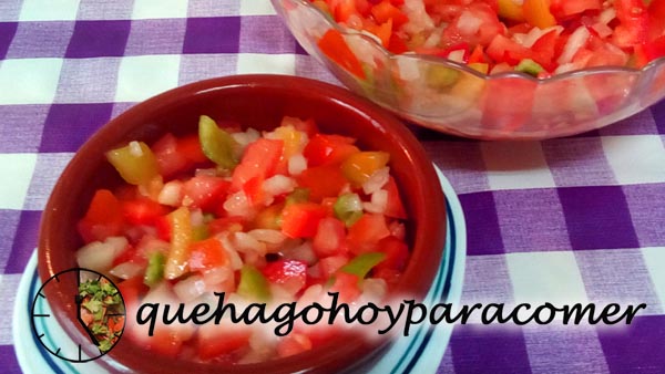 Lavamos bien las hortalizas, las secamos, y cortamos en daditos, tanto el pimiento como el tomate. La cebolla también la picamos en cuadraditos muy pequeños. Reservamos todo junto en una ensaladera y mezclamos.