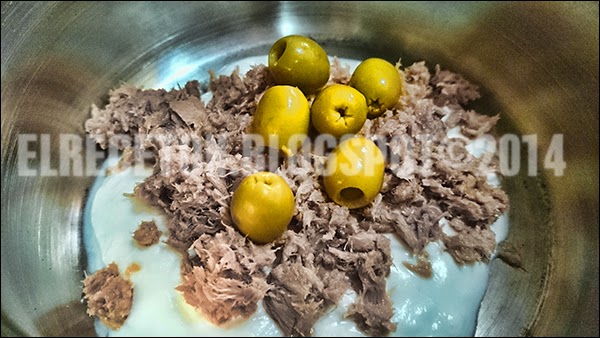 Primero de todo hay que tener en cuenta que no vamos a añadir a la receta ni el aceite del atún, ni el agua del yogur y las olivas. Así que sabiendo esto cogeremos entre 6 y 8 olivas y el atún desmenuzado y lo tiraremos en un vaso largo (el de hacer mayonesa sirve)