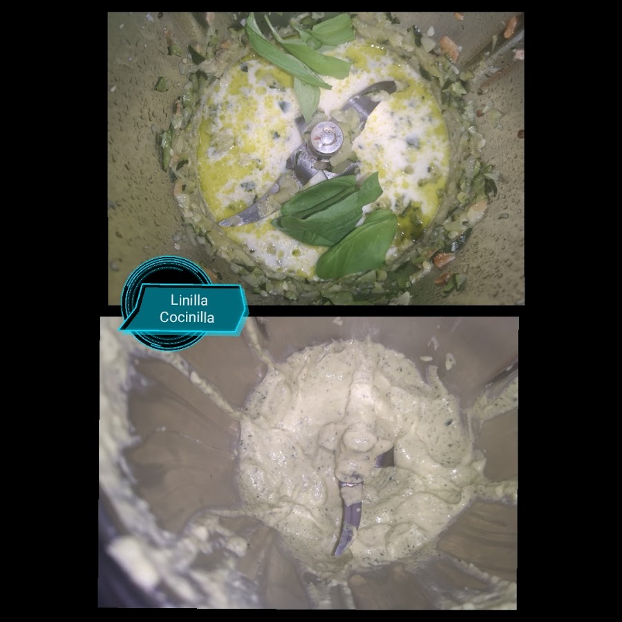 4. Agregue la albahaca y la nata (crema de leche). Triture 1 min/vel 5-10 progresivamente y programe 2 min/100ºC/vel 2. Utilice a conveniencia.