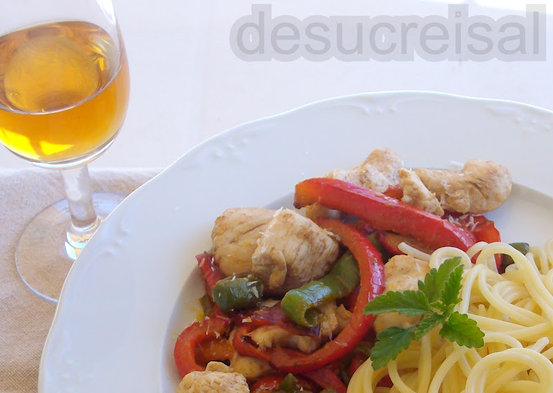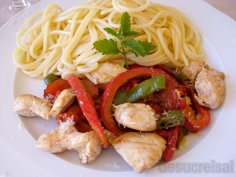 cocer los espaguetti con agua con sal y la hoja de laurel ,hasta que esten al dente ,escurrir bien y reservar al calor partir el pollo en tiras y saltear en una sarten con un poco de aceitdurante 5 minutos añadir los ajos machacados y la guindilla en caso de que os guste pincante,y el jengibre .Dejar un par de minutos mas he incorporar los pimientos en tiras
