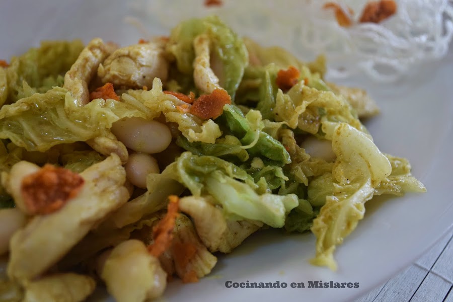 Cortamos la col y la pechuga en tiritas.