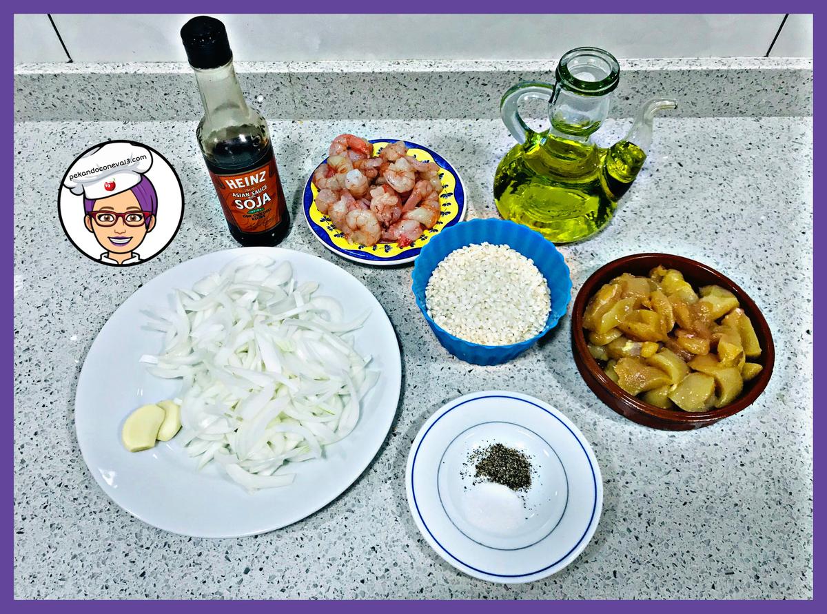 En la misma sartén añadimos la cebolla y los ajos picados y dejamos que se vaya haciendo, una vez esté dorada añadimos sal, el pollo, las gambas y el arroz, le damos vueltas con una espátula para integrarlo todo y añadiremos la salsa de soja (entre dos y tres cucharadas soperas, va a gusto del consumidor, yo he puesto 3) lo volvemos a remover para que se integre y ya lo tenemos listo