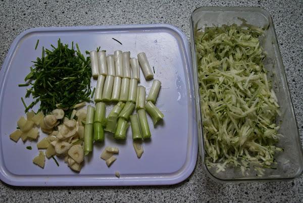 - Lo primero que hacemos es preparar las verduras. Rallamos el calabacín, troceamos el cebollino y las cebolletas (estas últimas en trozos medianos), y fileteamos el jengibre y el ajo en rodajas finas.