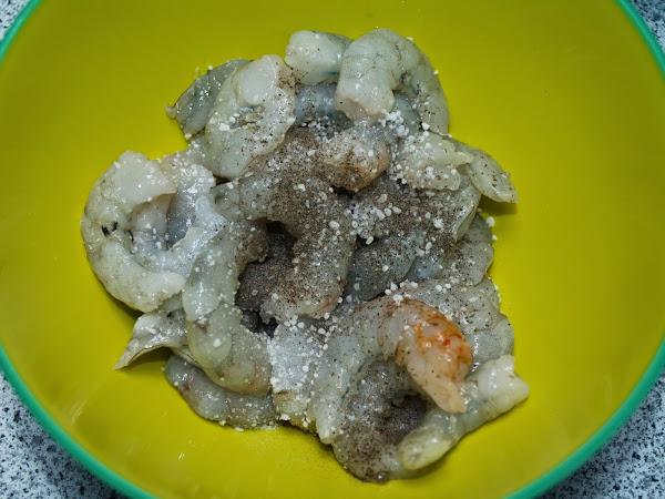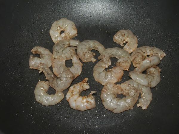 - A continuación pelamos los gambas y salpimentamos.