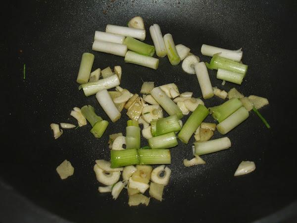 - A fuego algo más suave (y con algo más de aceite si hace falta) hacemos las cebolletas junto con el ajo y el jengibre.