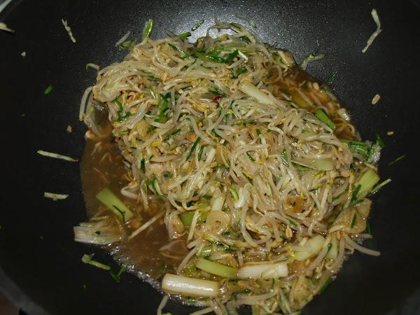 - Cuando estén más bien hechos, añadimos los brotes de soja, el calabacín y el cebollino, y los hacemos ligeramente, removiendo frecuentemente para que no se quemen ni se hagan de más. Añadimos entonces la salsa y dejamos hacer, moviendo también de vez en cuando, hasta que se consuma la mayor parte del líquido (el calabacín suelta bastante agua, así que si veis que no se reduce todo lo necesario, podéis descartar parte del líquido luego, para evitar que se os hagan de más las verduras en este punto).