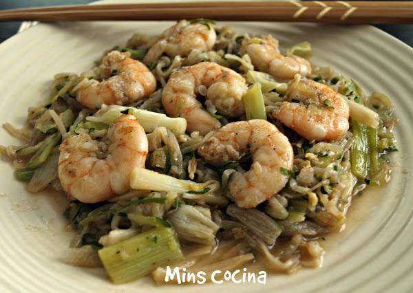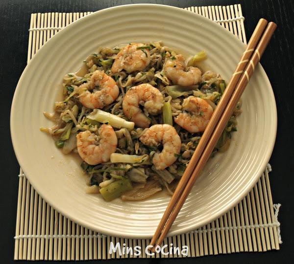 Esta receta está basada en el Tôm Rang Mu?i (salteado de gambas picantes) y en el salteado de gambas de Cuadernos de cocina oriental, que me encantó. Yo he hecho algunas modificaciones, por ejemplo añadir calabacín rallado. Más que nada porque me había sobrado y necesitaba darle uso (aquí no se tira nada!), y pensé que le iría bien. No me equivoqué. Así quedó la cosa: