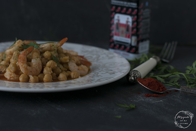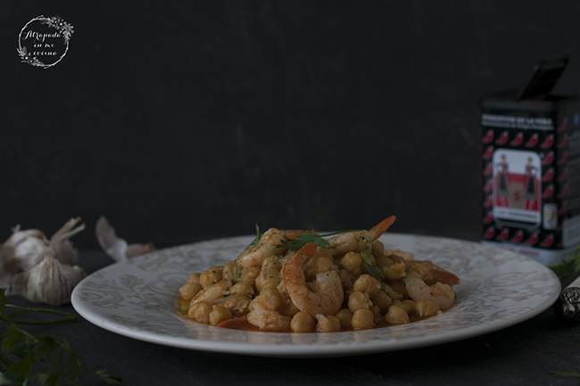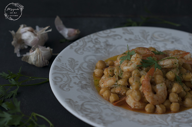 Hoy miércoles un plato de los que no sólo me gustan, sino que me encantan. Gambas o langostinos, ya sabéis que son mi perdición. Y esta vez combinados con garbanzos, en un plato ideal para no renunciar a las legumbres en verano. Lo podéis hacer con garbanzos de bote ya cocidos o si no cocerlos vosotros en casa, eso ya depende del tiempo que tengáis. Podéis poner gambas o langostinos, los míos esta vez langostinos congelados, y así abaratamos también el plato. La receta la vi en un libro de cocina y fue amor a primera vista.