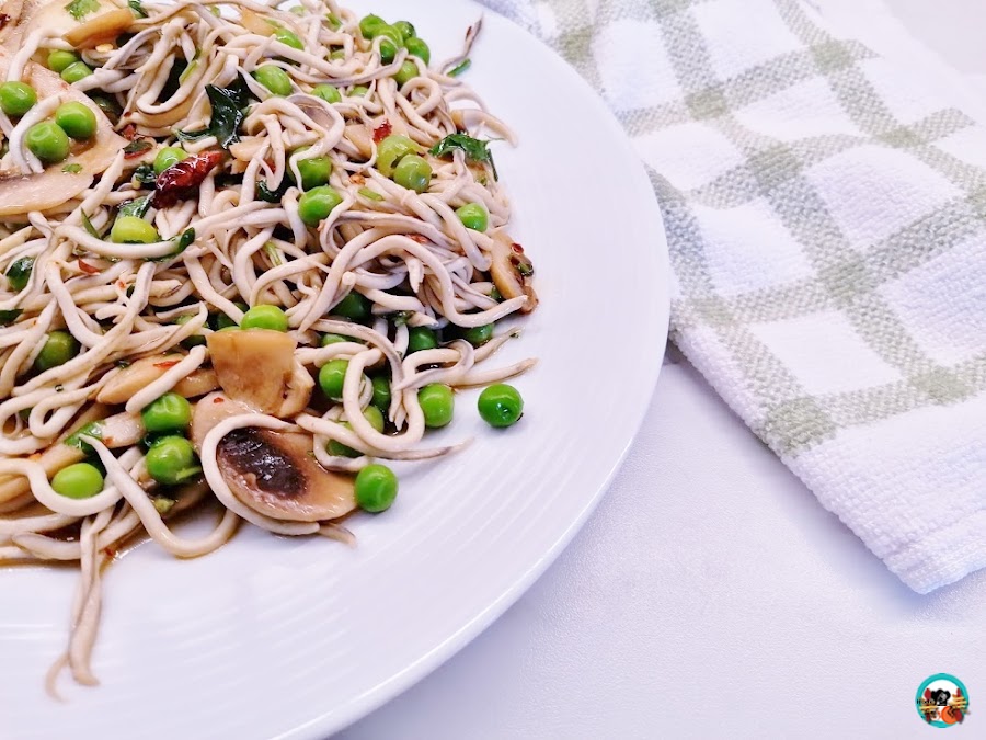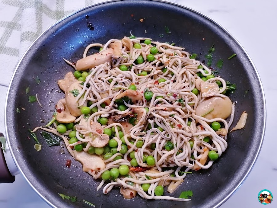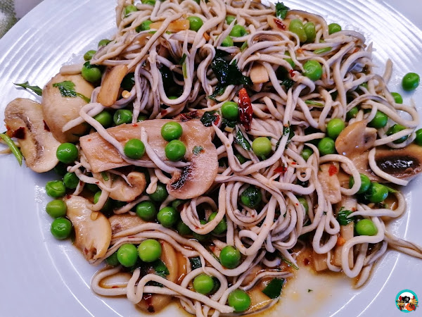 Hoy toca cocina rápida y con pocos ingredientes; angulas sucedáneas con champiñones y guisantes.