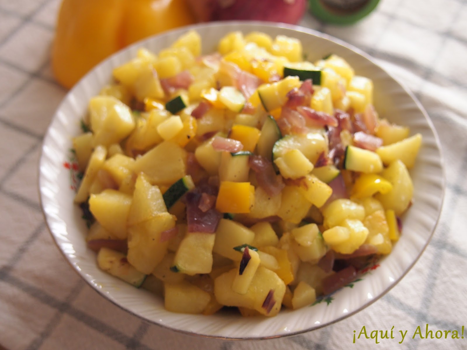 Elaboración:Lavamos y cortamos las verduras en trocitos pequeños. Cortamos en dados medianos las patatas, le añadimos una pizca de sal y removemos.