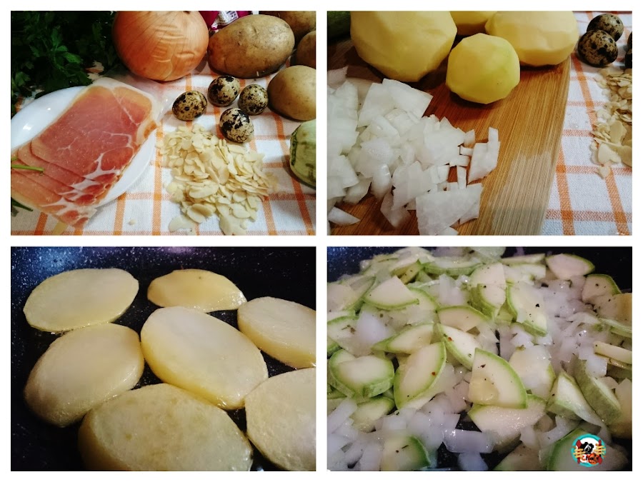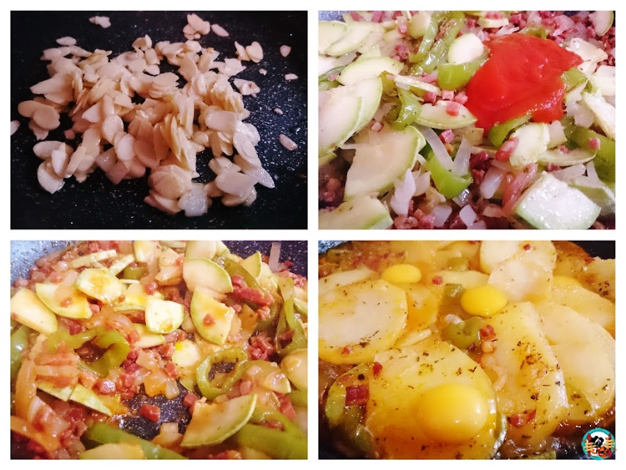 2.- Pelamos la cebolla y la cortamos en dados pequeños, lavamos y cortamos a cuadro el calabacín, lavamos el pimiento y lo cortamos en rodajas, pelamos los ajos y los cortamos en laminas. En la misma cazuela donde freímos patatas, doramos las laminas de almendras y las reservamos. Después, vamos sofriendo las verduras, primero la cebolla y los ajos. Seguimos con el calabacín y el pimiento verde, salpimentamos y agregamos el orégano, el tomillo y las lonchas del jamón picadas. Cocinamos todo unos 5 minutos más.