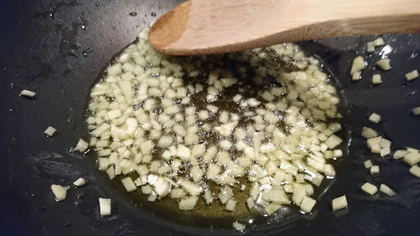 En un wok o sartén amplia, calentamos un poco de aceite de girasol y añadimos los dientes de ajo picados. Los dejamos que cojan color y saquen su aroma a relucir 1-2 minutos (que no se quemen).