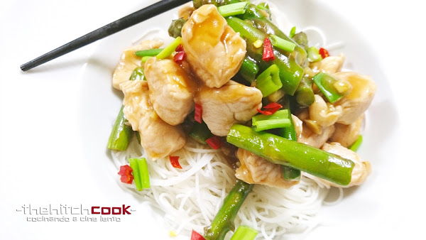 Servimos los fideos chinos (ya colados) en la base del plato y añadimos el salteado de pavo y espárragos por encima. Por último (si te va la marcha) puedes añadir un poco de chile recién picado para dar caña al plato y al paladar. ¡Que aproveche, hitchcookian@s!