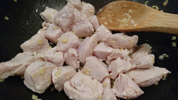 Empezamos troceando el pavo. Para ello - recomendación personal - es comprar una buena pechuga entera y trocearla en casa con un cuchillo bien afilado. Así nos garantizamos los trozos a nuestro gusto y podemos limpiarla sin problemas. Lleva más tiempo, pero con una copa de vino y música de fondo todo se hace más llevadero en la cocina... Los salpimentamos con sal y pimienta blanca y reservamos hasta que llegue su escena.