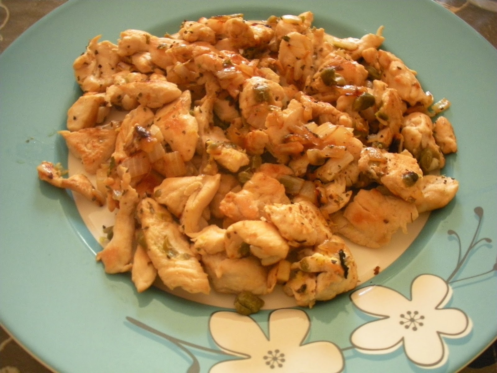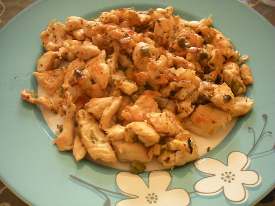 En la misma sarten ponemos los filetes de pollo cortados en tiras y rehogamos a fuego lento unos 10 minutos.