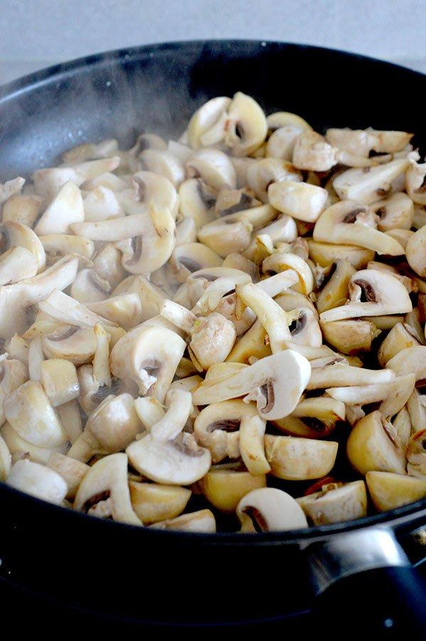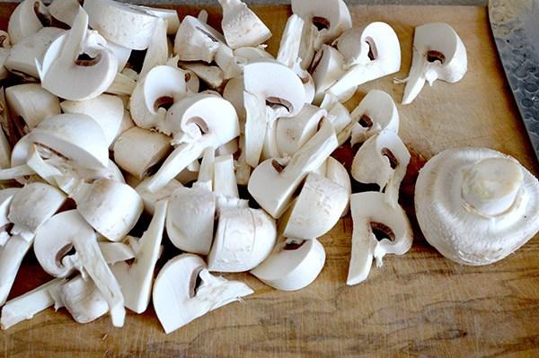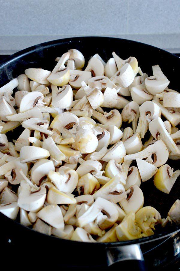 Mientras tanto limpiamos los champiñones con un trapo y los partimos en 4 o en 8 dependiendo del tamaño.