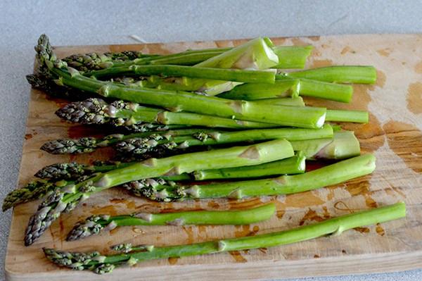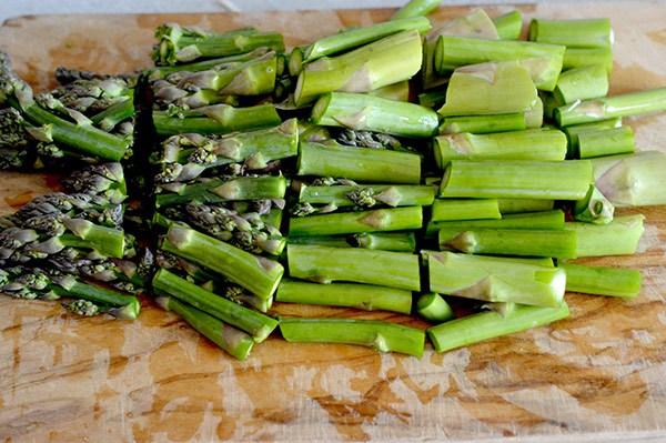 Limpiamos los espárragos verdes, desechamos la parte dura y los cortaos en 3-4 trozos.