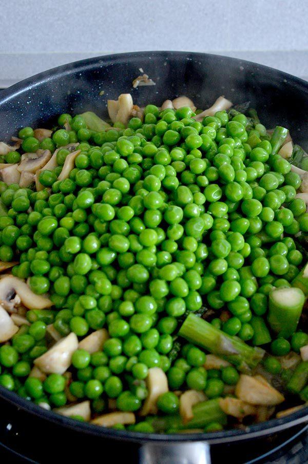 Añadimos los guisantes y cocinamos otros 2 minutos hasta que este todo bien mezclado! Ha de quedar un poco crujiente y verde intenso para que mantenga la frescura y todo su sabor.