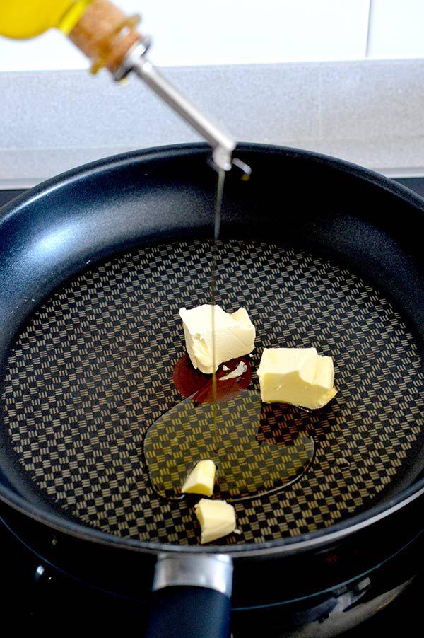 En una sartén derretimos la mantequilla junto con un chorrito de aceite para que no se queme.
