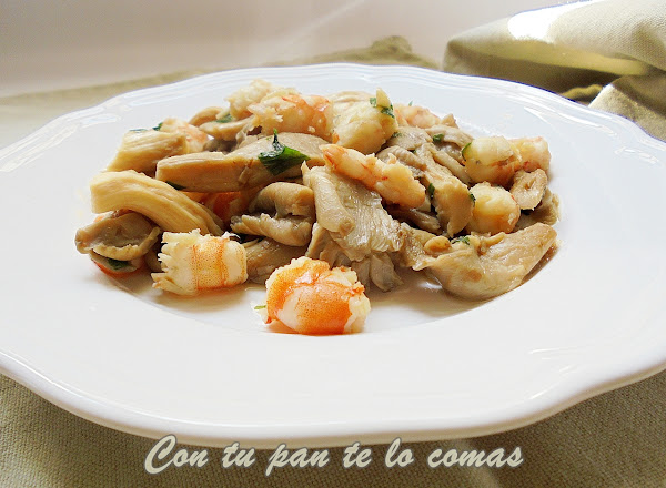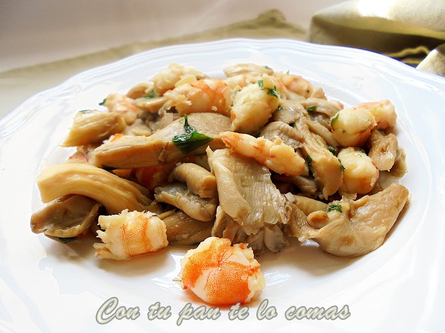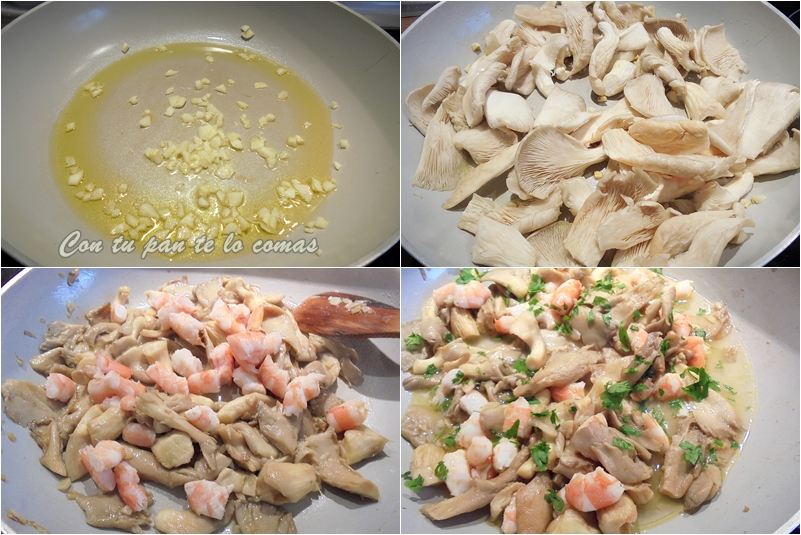 Yo le he puesto setas de cardo pero cada uno le puede poner la variedad que más le guste, o champiñones, y en vez de langostinos puedes poner gambitas, gambones... vamos que aunque no hace falta decirlo cada uno lo tunea a su manera y a sus gustos.