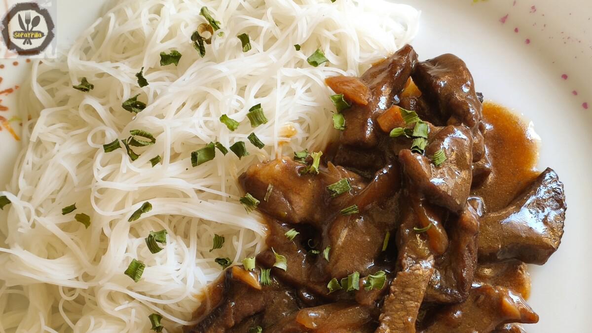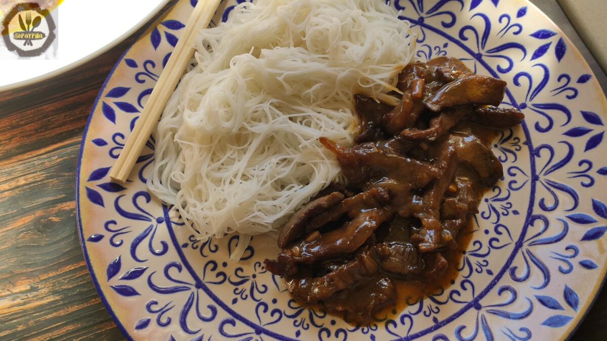 Servimos el plato con unos fideos de arroz, que se preparan en un plis y así aprovechamos bien la salsita de la carne.
