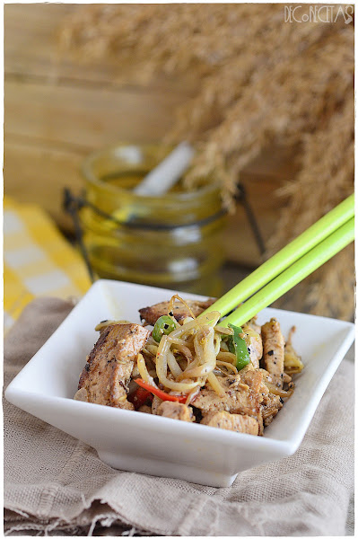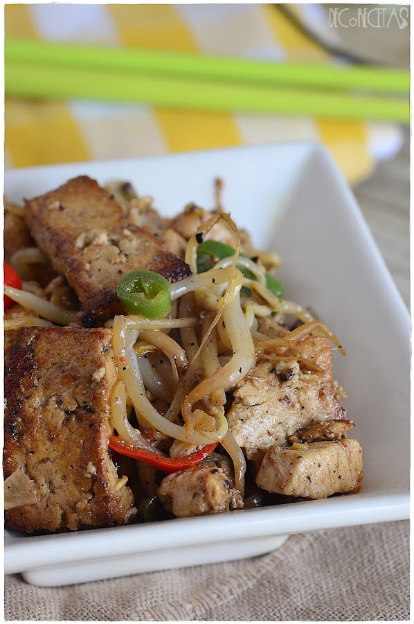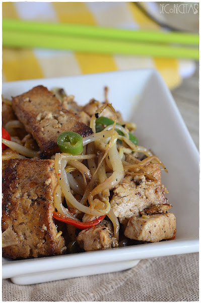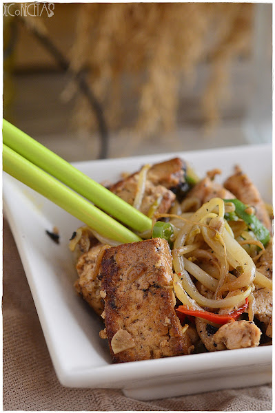 En un wok, calentamos el aceite y doramos los bastones de tofu. Acto seguido, añadimos el ajo y pollo hasta que doren. Por último, los brotes de soja y las salsas de ostras y soja junto con las guindillas. Salteamos 1 minuto y listo!