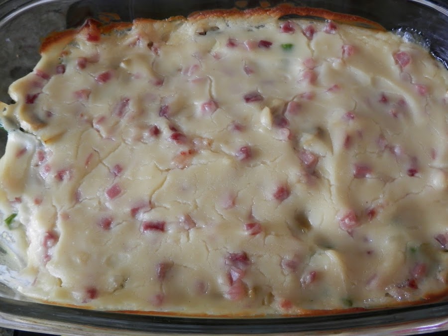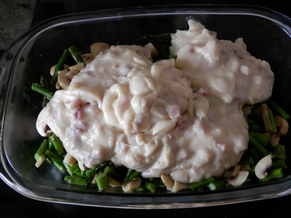 Echamos la bechamel de jamón por encima del salteado e introducimos en el horno.