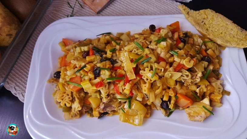 Salteado de sopa, elaboración:1.- Pasamos por un colador el caldo de la sopa, desmenuzamos la carne. En una sartén grande o caldero chato, ponemos a sofreir con un poco de aceite de los dientes de ajo cortados en láminas y las uvas pasas unos minutos, sin que lleguen a quemarse. Añadimos las verduras con la carne las salteamos unos minutos, agregamos la soja, el curry y la salsa inglesa. Lo salteamos las verduras 5 minutos a fuego medio, lo retiramos del fuego y servimos con un poco de cebollino fresco picado por encima.