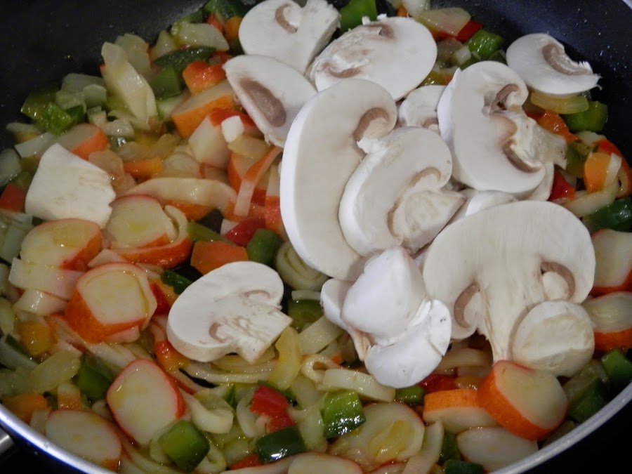 Cuando ya estén las verduras casi hechas añadiremos los champiñones y rehogaremos un poquito.