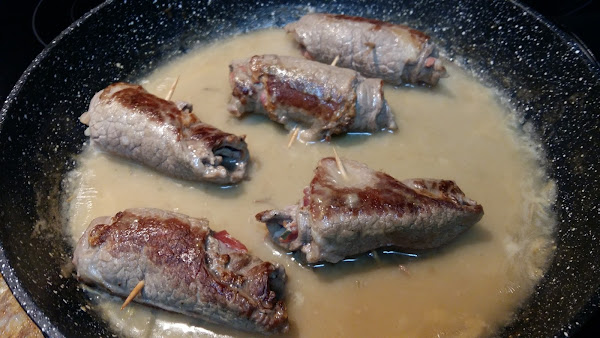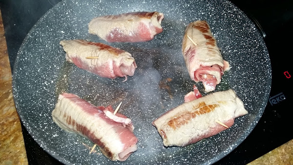 Poner la cucharada de aceite en una sarten y dorar los rollitos de carne.