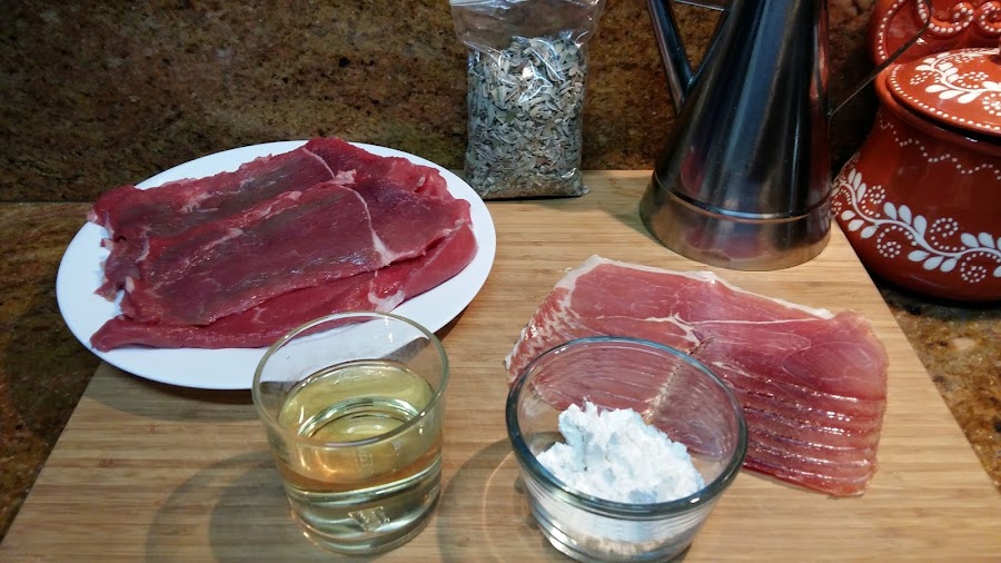4 filetes finos y aplanados de ternera (150g cada filete), 4 lonchas finas de jamón curado, salvia, 1 cucharada de harina, 1 vasito de vino blanco, 1 cucharada de aceite de oliva, pimienta negra molida y sal