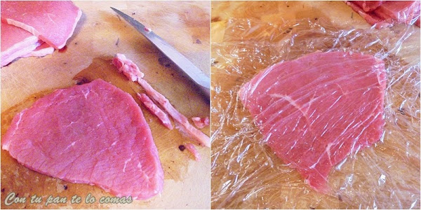 1. Primero hay que cortar todos los bordes grasos de los filetes y luego hay que aplanarlos lo más posible. Puedes hacerlo entre dos láminas de papel film con un mazo o ablandador, y si no tienes lo puedes hacer con el rodillo.