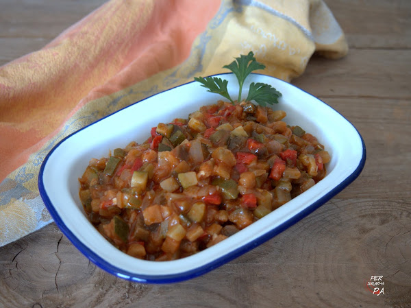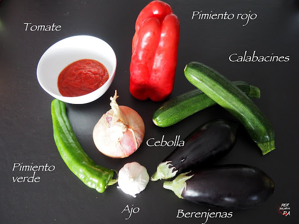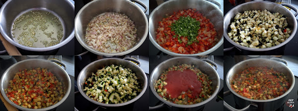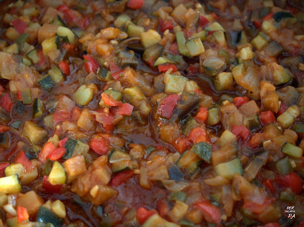 Antes de que empiece a tomar color añadir la cebolla y dejarla pochar. Cuando empiece a estar blanda incorporar el pimiento rojo y el pimiento verde, mezclar y dejar cocer dos o tres minutos. Incorporar las berenjenas, mezclar bien y cocer unos cinco minutos más o menos. Añadir el calabacín y repetir el proceso, mezclar y cocer otros dos o tres minutos. Por último incorporar el tomate triturado, salpimentar al gusto y mezclar.