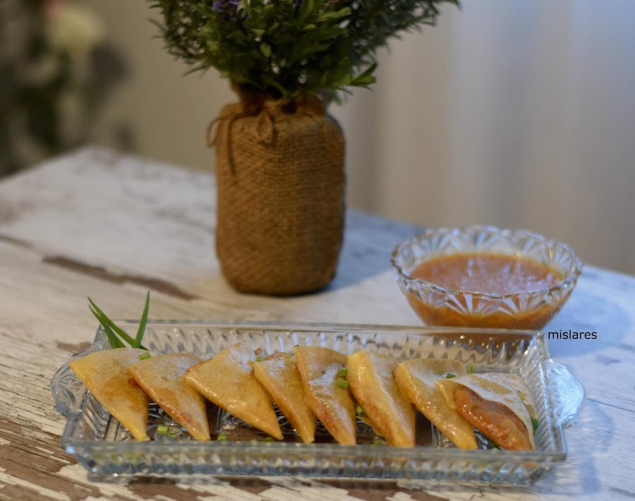 Con el resto de la salsa puedes servirla caliente para untar las samosas o bien guardarla para otro día, congela bien. Las famosas también he congelado alguna pues me han salido unas cuantas y ahora solo estamos 2 para comer jajajaj.