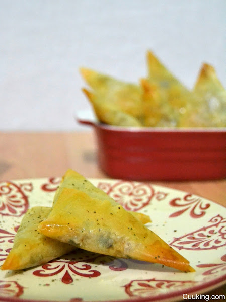 6.- Ponemos las samosa en una fuente con papel de horno con el cierre hacia abajo y horneamos a 180ºC durante unos 7- 10 minutos hasta que estén doradas. Servimos enseguida. ¡Buen provecho!