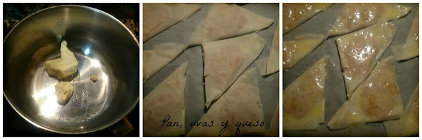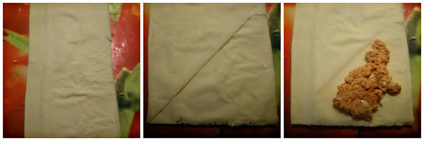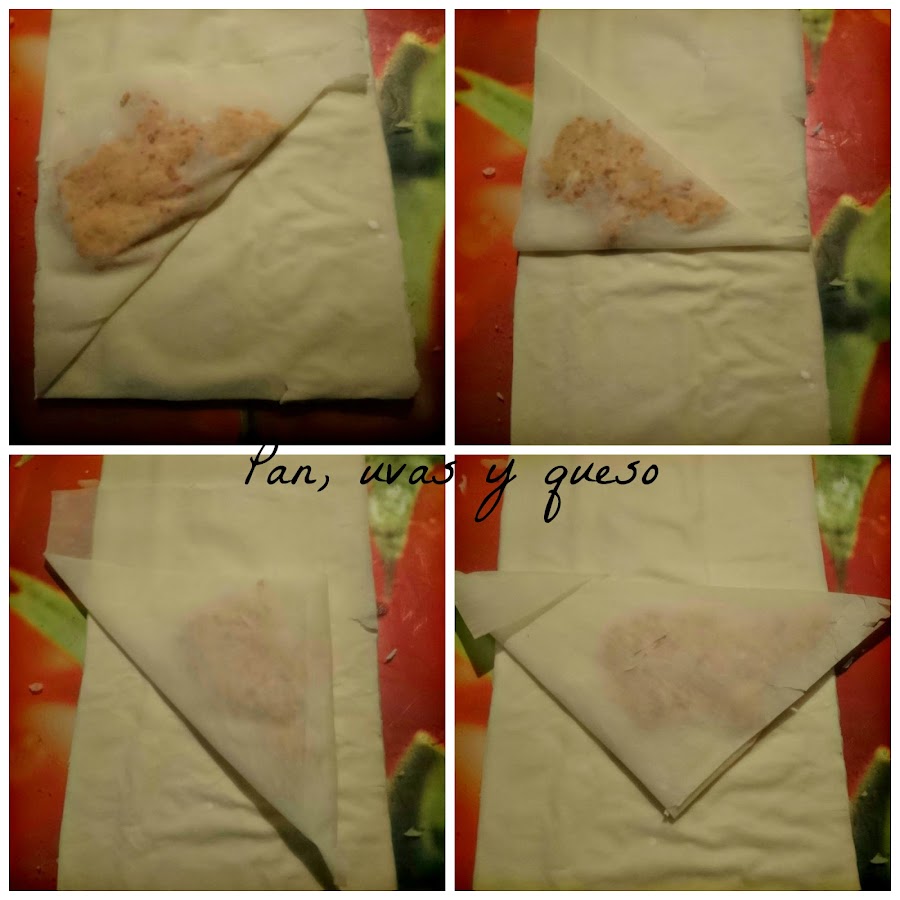 Colocamos una cucharada de relleno (aproximadamente) en la parte inferior de la hoja. Doblamos en forma de triángulo y vamos plegando la hoja sobre sí misma, hasta conseguir un triángulo. Repetimos el proceso hasta que terminemos con las 12 porciones de masa.
