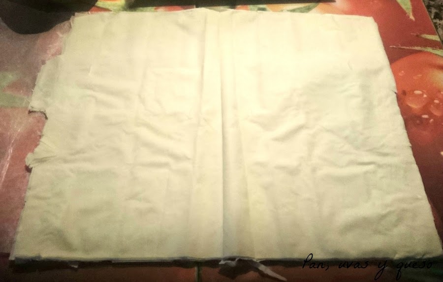 Desenrollamos la masa y la cortamos en 3 partes iguales. Solamente vamos a utilizar 12 hojas, así que podemos guardar el resto en la nevera. Si queréis preparar todas las hojas para hacer samosas tendréis que hacer más relleno.