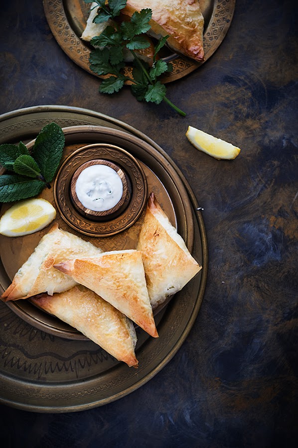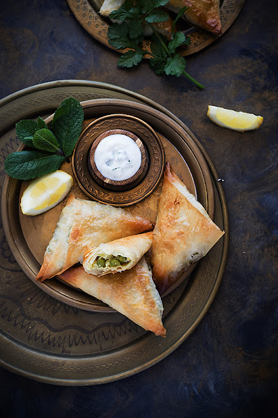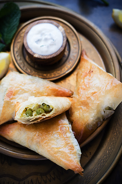 Éstas que os traigo están hechas con pasta filo y rellenas de patata, guisantes y cebolla aderezados con curry y cilantro. Me decanté por hornearlas en vez de freírlas y acompañarlas de una sencilla salsa de yogur. El resultado fue delicioso.