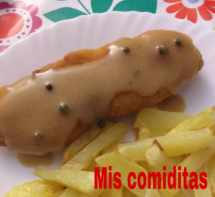 Esta vez la serví con salsa a la pimienta que le viene bien no sólo a la carne, un sobrecito de esos que venden en cualquier súper y que está tan rico. Ya sabéis que prefiero hacer las cosas personalmente en vez de comprar preparado, pero éste es uno de los que sí me gustan, Tiene muy bien conseguido el sabor, de cualquier forma en internet hay infinidad de recetas de cómo hacerla.