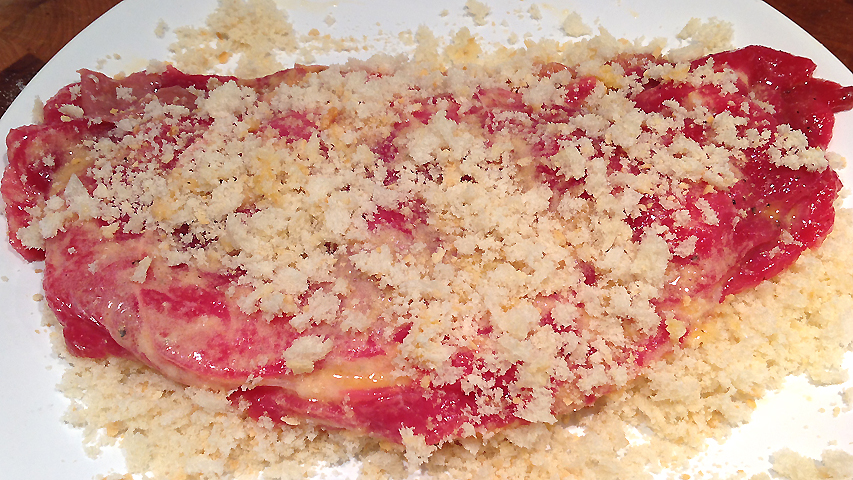 Reboza en el pan rallado apretando con las manos para que el pan quede bien prensado y no se suelte.