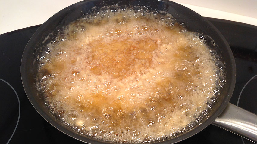 Prepara una sartén con el aceite y con el fuego medio-alto (7/10) y deja que se caliente. Puedes añadir una miga de pan y así podrás saber cuando empiece a freírse que la temperatura es la ideal para freír el san jacobo.