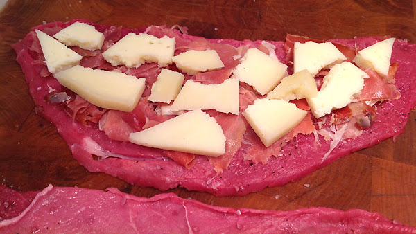 Pongo trozos de queso de oveja curado sobre los trozos de jamón.