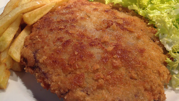 Yo adorno con un poco de perejil fresco picado y lo he acompañado de unas patatas fritas y una ensalada de escarola aliñada con sal, pimienta molida, zumo de limón y aceite de oliva.