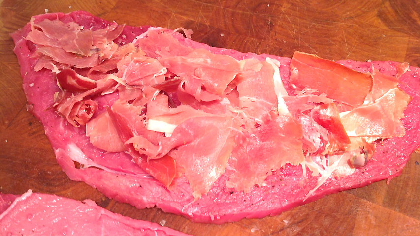 Pongo el jamón serrano sobre uno de los filetes. A mi me gusta ponerlo en trocitos para que sea más fácil de cortar a la hora de comer.