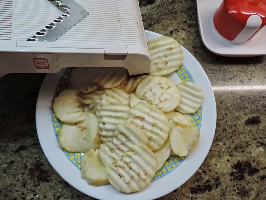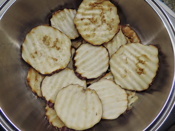 Cortamos las berenjenas con la mandolina.