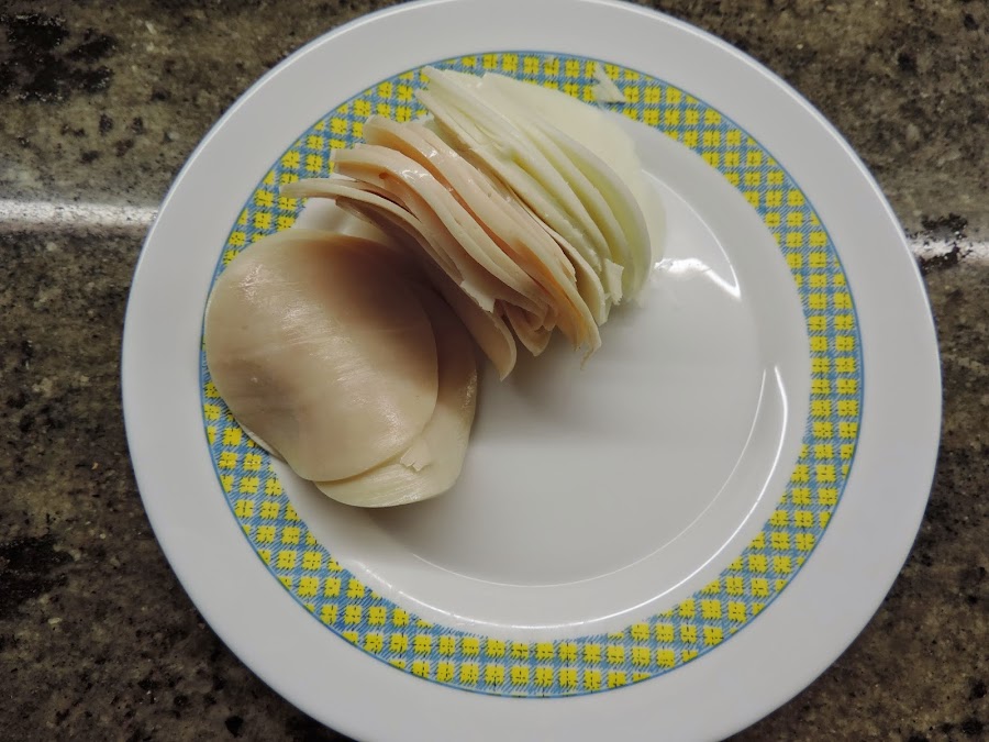 Cortamos las lonchas de pechuga de pavo el queso lo más fino que podamos.